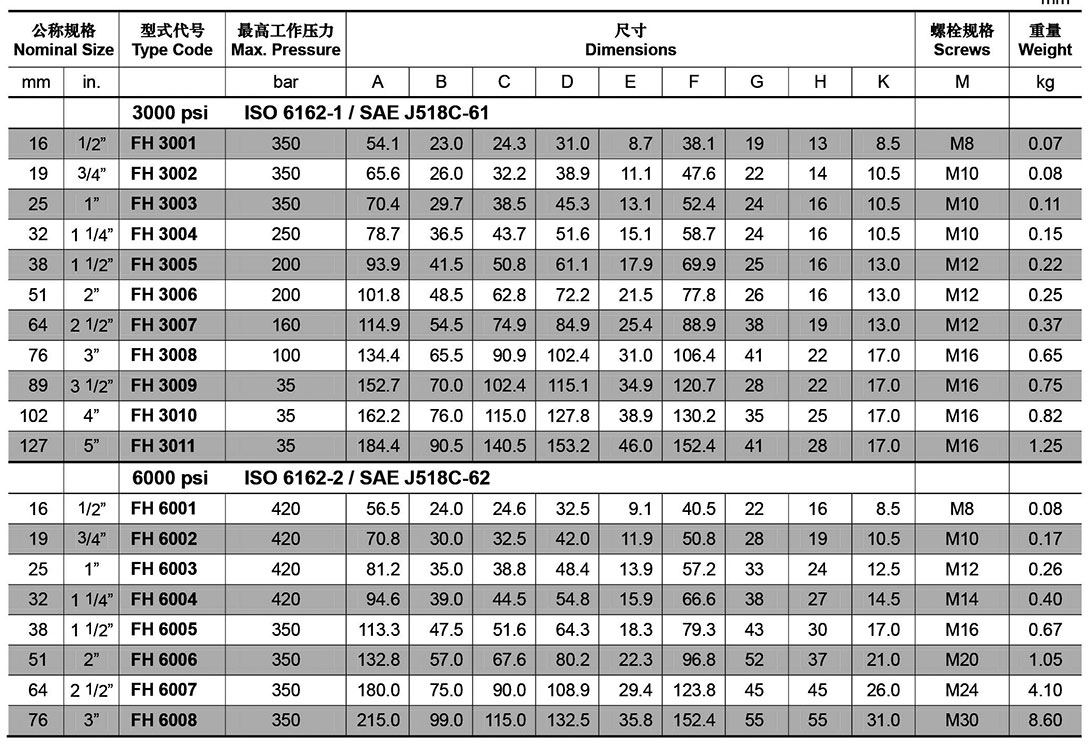 SAE法兰系列(FH SAE对开法兰夹)适用于液压系统及各种高压管系的安装连接,各种形式的法兰连接可按成套组件供货,也可单独提供零件,产品适用标准SAE J518、JB/ZQ4187、ISO 6162、ISO 6164.