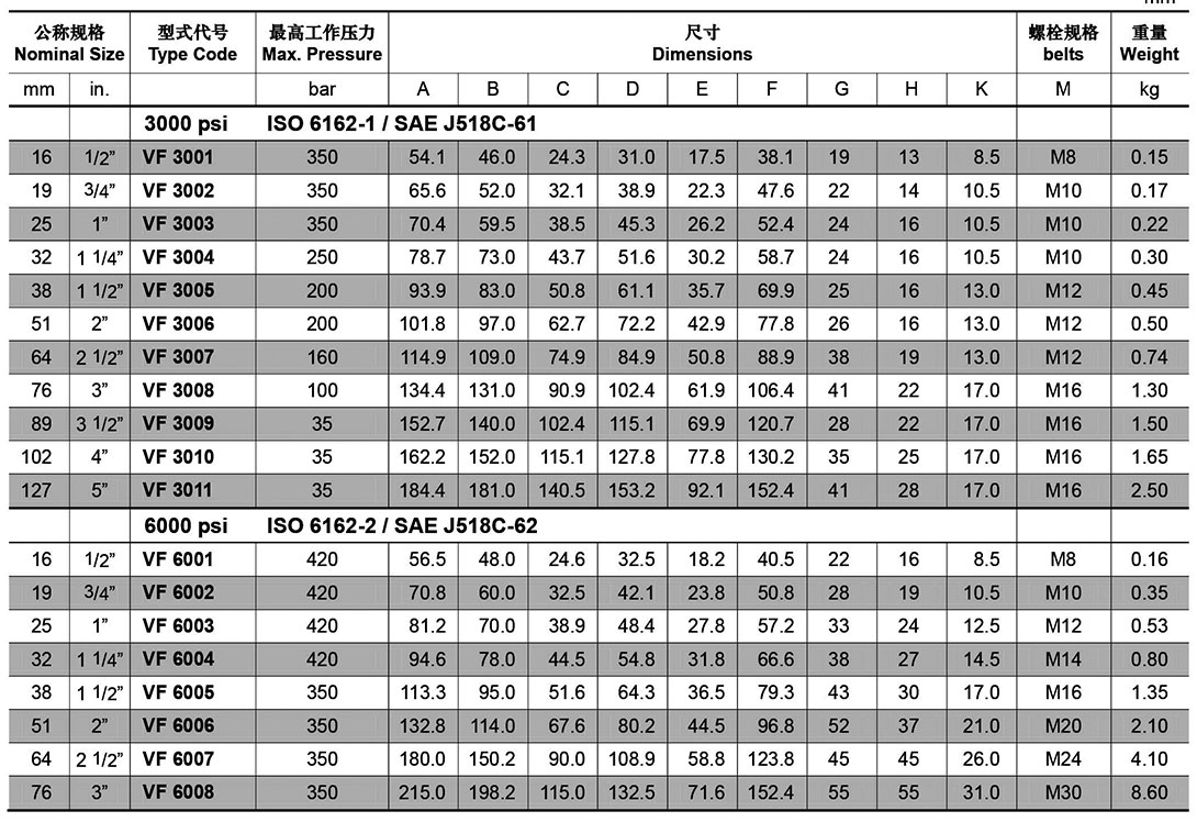 SAE法兰系列(VF SAE整体法兰夹)适用于液压系统及各种高压管系的安装连接,各种形式的法兰连接可按成套组件供货,也可单独提供零件,产品适用标准SAE J518、JB/ZQ4187、ISO 6162、ISO 6164.