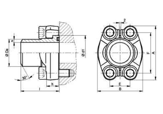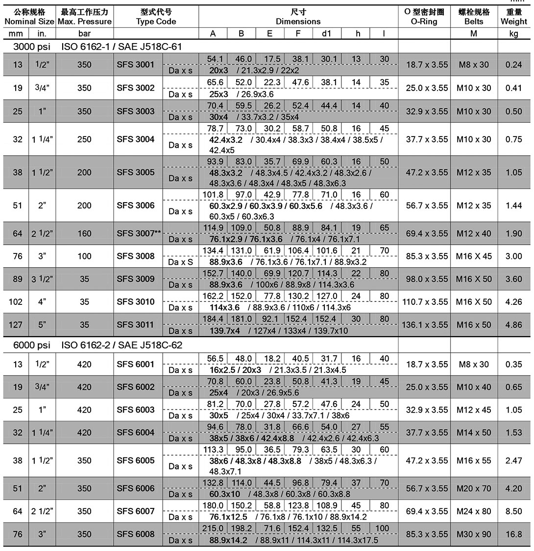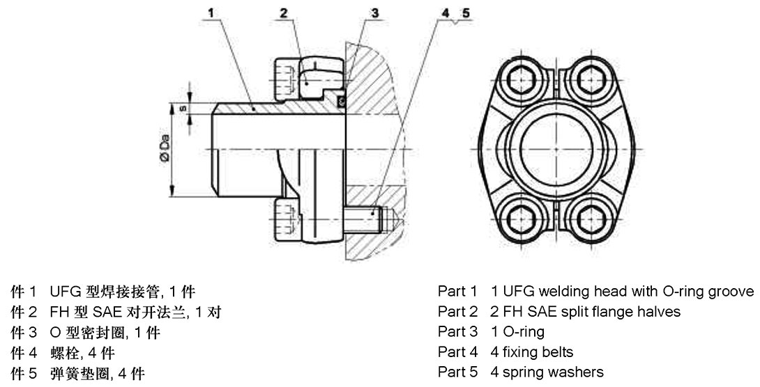 SFS单头焊接管式SAE对开法兰组件主要用于通径大于DN13(1/2")液压系统管道连接,可用以对液压泵及集成阀块油口的直接连接,产品适用标准SAE J518、JB/ZQ4187、ISO 6162、ISO 6164,供货范围包括下列零件: