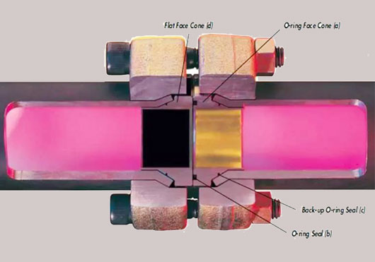 37°扩口式法兰是一种典型的非焊接管路连接形式,适用于1/2''-8''或20-219mm的碳钢或不锈钢液压管路系统,工作承压高达420bar(6000PSI),符合SAE Code 61、SAE Code 62、ISO6164标准,其法兰形式适合任何管路安装。其结构主要包含37°扩口管路、两个内锥体并都带有与坡口接触的O型圈,其中一个椎体带有端面O型圈槽,同时配套2个标准法兰和螺栓螺母。其中内锥体可以换成带有泄放旋塞的加长椎体。